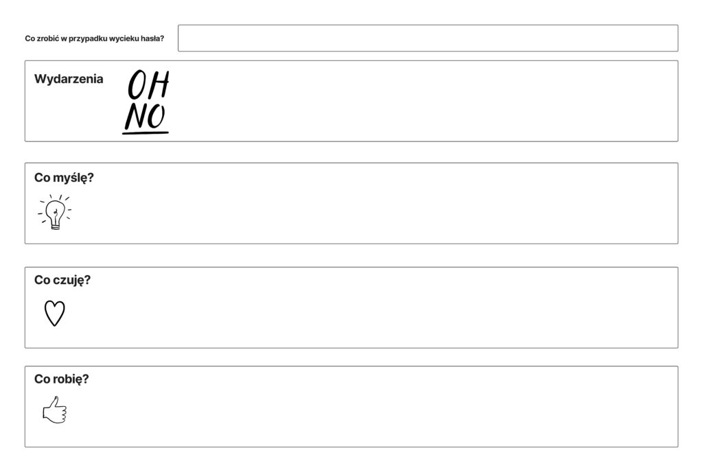 Potraktuj całość jak historię zaczynającą od „nieszczęsnego wydarzenia (incydentu)” – na przykład odkrycia wycieku hasła. Ważne, aby utrzymać formę konwersacji i podzielić się swoimi przemyśleniami, emocjami oraz działaniami, które podjęlibyście w tej sytuacji.