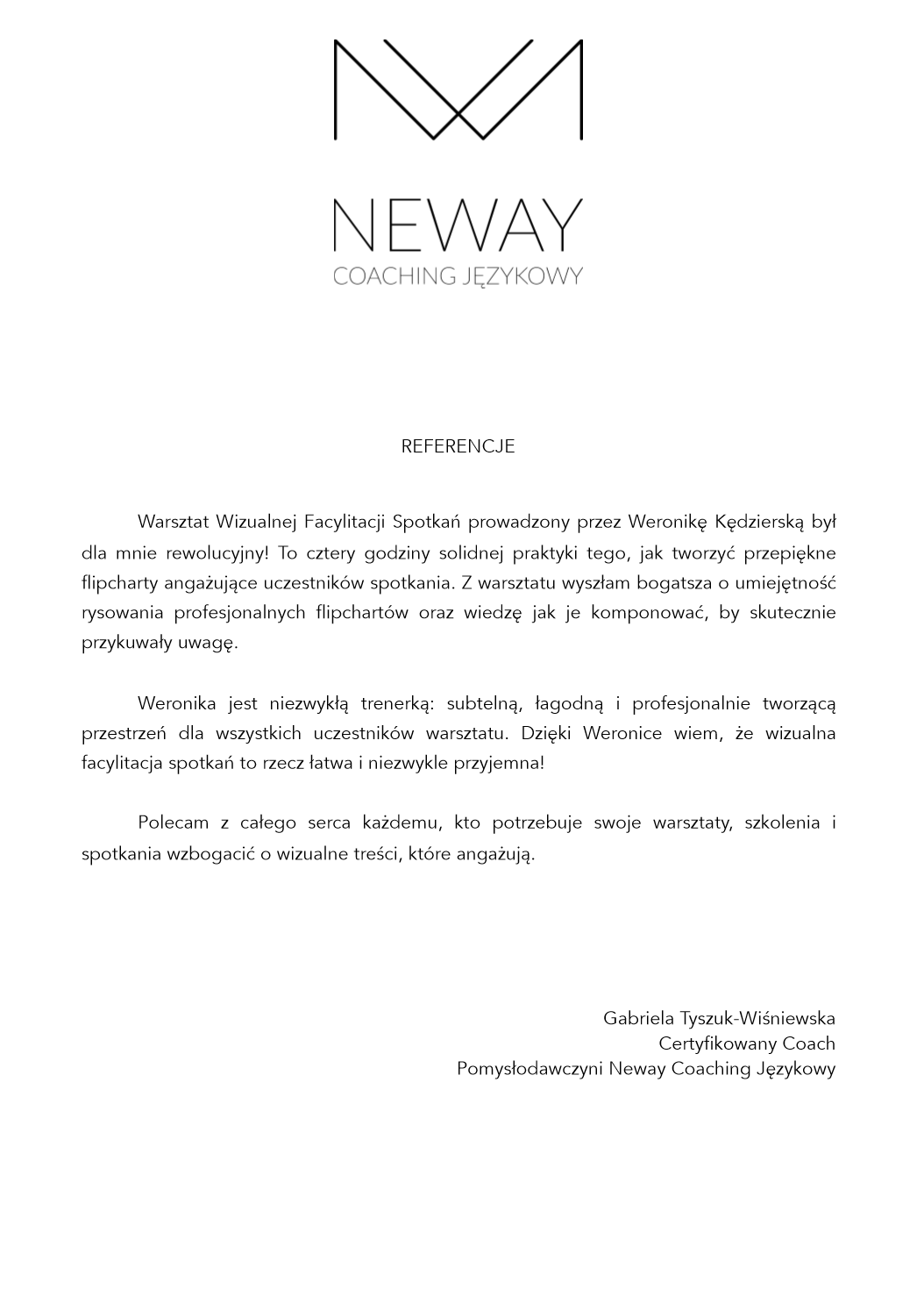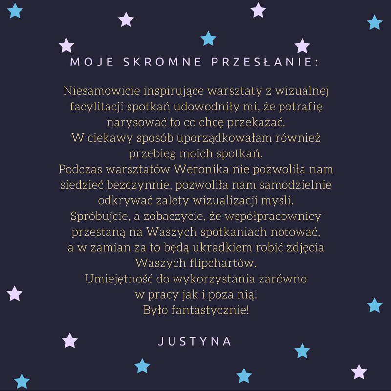 Miałem przyjemność uczestniczyć w warsztatach z wizualnej facylitacji spotkań Weroniki i były to najlepiej wykorzystanie godziny w tym tygodniu Mądrze prowadziła uczestników przez meandry rysowania aż po punkt, w którym każdy poczuł się pewnie w wizualizowaniu swoich pomysłów. Dzieliła się szczodrze doświadczeniem i dzięki temu od tego czasu po prostu korzystam z nowych zdolności w codziennym życiu. Polecam.Paweł Jabłoński